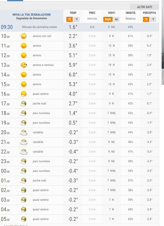 Al mattino Sereno con innocue velature, al pomeriggio Sereno, la sera Nubi sparse con ampie schiarite, la notte Nubi sparse con ampie schiarite.