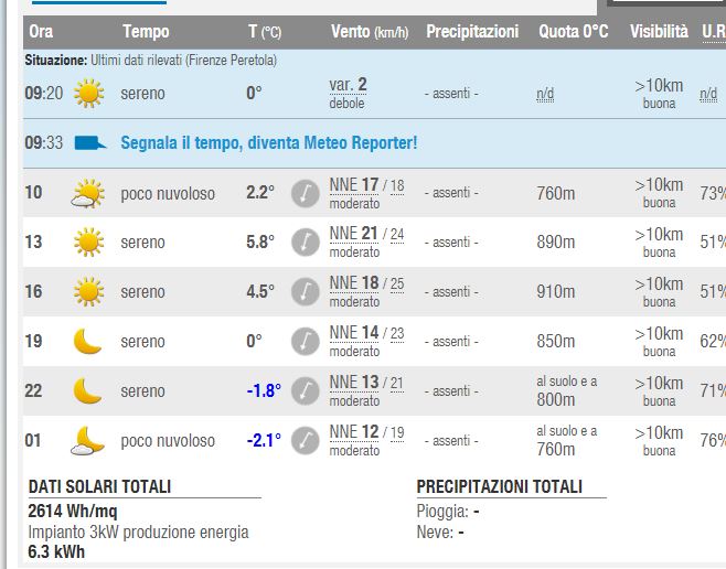 A Siena oggi cieli in prevalenza sereni o poco nuvolosi per l’intera giornata, non sono previste piogge. Durante la giornata di oggi la temperatura massima registrata sarà di 6°C, la minima di -0.6°C, lo zero termico si attesterà a 975m. I venti saranno al mattino deboli e proverranno da Nord, al pomeriggio moderati e proverranno da Nord. Nessuna allerta meteo presente.