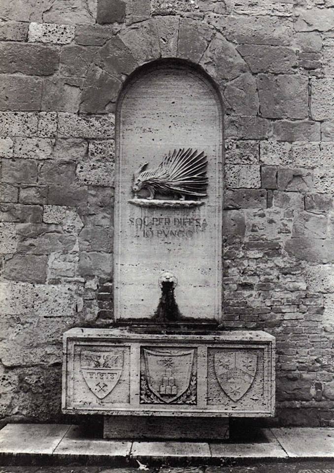 ” Il 10 gennaio 1962 viene presentata al popolo di Camollia la fontanina realizzata dallo scultore Vico Consorti. ce si trova in Via Malta ed è composta da una vasca rettangolare in travertino ornata con gli stemmi delle Compagnie Militari ed in alto riporta il motto dell’Istrice “Sol per difesa io pungo”. L’acqua per il battesimo contradaiolo esce dalla bocca di leone, ricordo dell’omonima contrada soppressa della quale l’Istrice ha inglobato il territorio. Sono presenti anche gli stemmi di personaggi di rilievo della Contrada di Camollia: il conte Guido Chigi Saracini, il barone Sergardi, l’avvocato Verzili. Il barone Fabio Sergardi Biringucci, capitano storico, al momento dell’inaugurazione della fontana era reduce dalla vittoria riportata sul Campo nel luglio 1961 con Uberta e Tristezza. Priore era Danilo Verzili. “