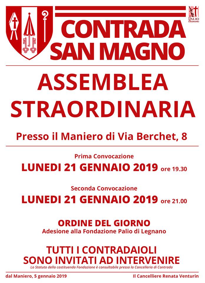 Palio di Legnano, Contrada San magno: 21/01 Assemblea Straordinaria Lunedì 21/01 presso il Maniero di Via Berchet 8, verrà svolta l’Assemblea Straordinaria Prima Convocazione Ore 19.30 Seconda Convocazione Ore 21 Ordine del Giorno Adesione alla Fondazione Palio di Legnano Condividi sul web: Fai clic per condividere su Facebook (Si apre in una nuova finestra) Facebook Fai clic per condividere su WhatsApp (Si apre in una nuova finestra) WhatsApp Fai clic per condividere su Telegram (Si apre in una nuova finestra) Telegram Fai clic per condividere su X (Si apre in una nuova finestra) X Fai clic qui per stampare (Si apre in una nuova finestra) Stampa Fai clic per inviare un link a un amico via e-mail (Si apre in una nuova finestra) E-mail Mi piace Caricamento... Correlati