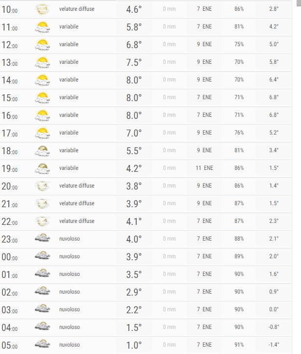 Al mattino Nuvoloso con locali aperture, al pomeriggio Nubi sparse e schiarite, la sera Nuvoloso per velature e stratificazioni anche compatte, la notte Nuvoloso con locali aperture.”