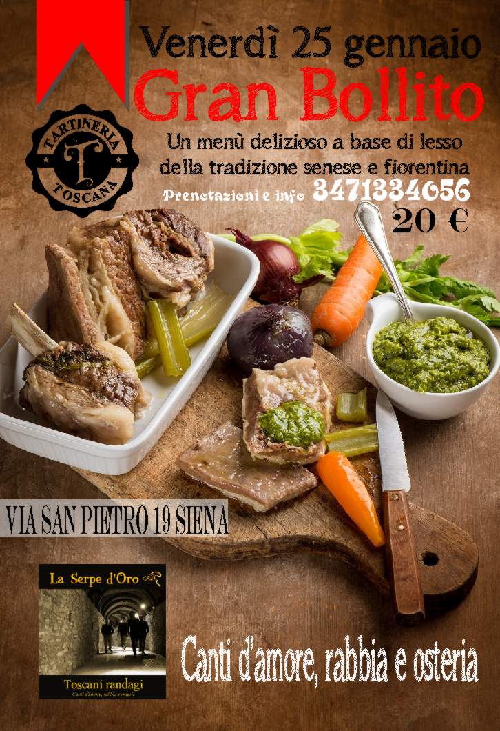 Il proprietario della Tartineria Toscana Simone, uno dei graditi e meravigluosi sponsor di questo sito, ci tiene a far sapere a tutti che Venerdì 25/01 organizza nel suo locale la Cena “Gran Bollito”. La cena prevede Un menù a base di lesso lesso della tradizione senese con accompagnamento di deliziose salse anch’esse della tradizione senese. Il tutto a 20€. Durante la serata canteranno stornelli “La Serpe d’Oro” gruppo Toscani Randagi con canti d’amore, rabbia e osteria.
