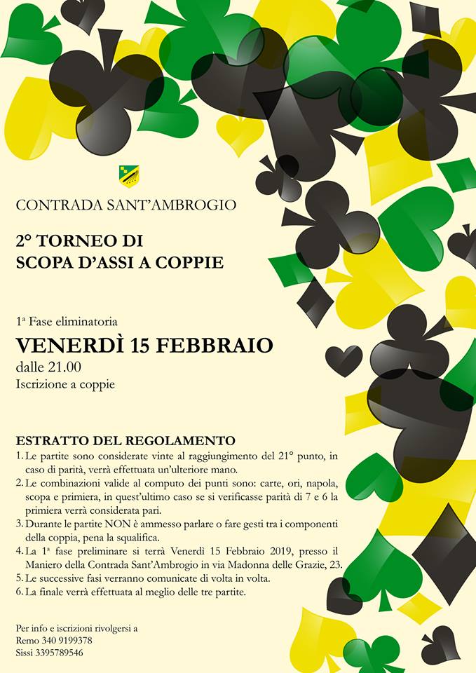 Palio di Legnano, Contrada Sant’Ambrogio: dal 15/02 ♥️♣️2° TORNEO DI SCOPA A COPPIE♠️♦️ ♥️♣️2° TORNEO DI SCOPA A COPPIE♠️♦️ Da venerdì 15 Febbraio ore 21.00 Per Iscrizioni: Remo 3409199378 Sissi 3395789546 Condividi sul web: Fai clic per condividere su Facebook (Si apre in una nuova finestra) Facebook Fai clic per condividere su WhatsApp (Si apre in una nuova finestra) WhatsApp Fai clic per condividere su Telegram (Si apre in una nuova finestra) Telegram Fai clic per condividere su X (Si apre in una nuova finestra) X Fai clic qui per stampare (Si apre in una nuova finestra) Stampa Fai clic per inviare un link a un amico via e-mail (Si apre in una nuova finestra) E-mail Mi piace Caricamento... Correlati