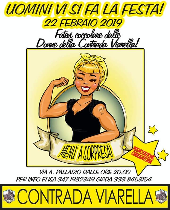 -22 febbraio- UOMINI VI SI FA LA FESTA 😍 una new entry della nostra Contrada! Per tutti gli uomini! Organizizzata questa volta dalle donne Viarelline! Vi aspetterà una grande serata! Tutto a sorpresa! 😎
