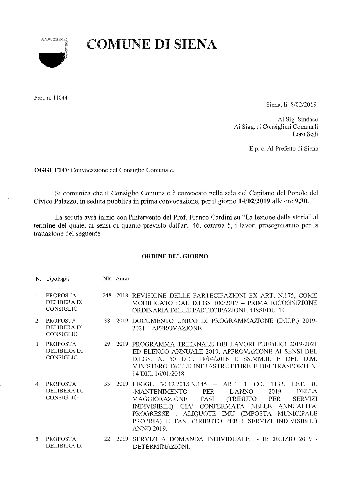 Il prossimo 14 febbraio si terrà la seduta del Consiglio Comunale nella Sala del Capitano del Popolo del Palazzo Pubblico, a partire dalle ore 9,30.