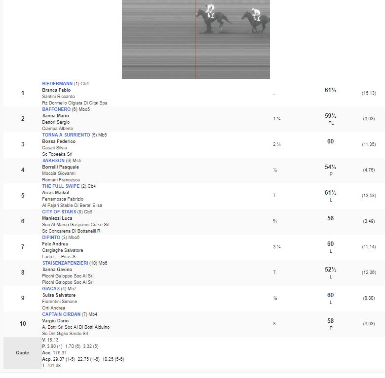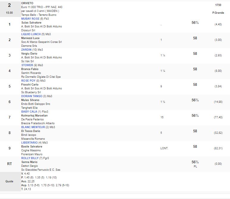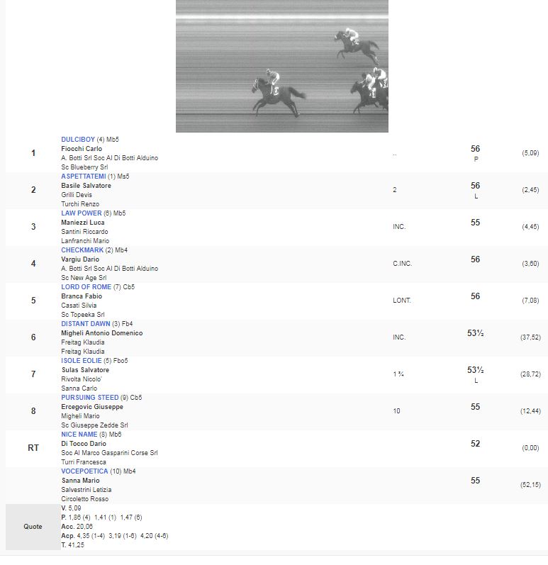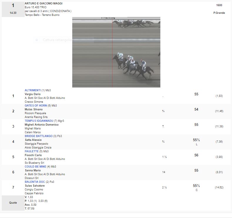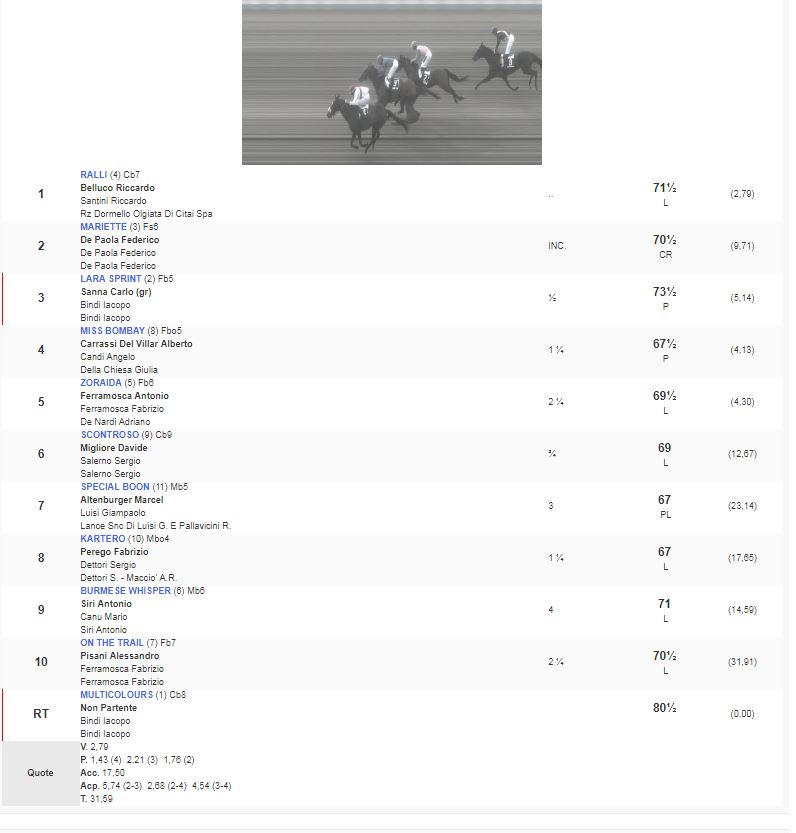 Ippica, Pisa: Oggi 10/02 Risultati Corse Odierne 1^ Corsa Premio Arturo e Giacomo Maggi vinta da Altrimenti 2^ Corsa Premio Orvieto vinta da Mubay Rose 3^ Corsa Premio William Corbin vinta da Ralli 4^ Corsa Premio Ildo Tellini vinta da Katie Goffs 5^ Corsa Premio Harry Bracci Torsi vinta da Bierdermann 6^ Corsa Premio Banca Popolare di Lajatico vinta da Dulciboy 7^ Corsa Premio Van Dick vinta da Constantine Condividi sul web: Fai clic per condividere su Facebook (Si apre in una nuova finestra) Facebook Fai clic per condividere su WhatsApp (Si apre in una nuova finestra) WhatsApp Fai clic per condividere su Telegram (Si apre in una nuova finestra) Telegram Fai clic per condividere su X (Si apre in una nuova finestra) X Fai clic qui per stampare (Si apre in una nuova finestra) Stampa Fai clic per inviare un link a un amico via e-mail (Si apre in una nuova finestra) E-mail Mi piace Caricamento... Correlati