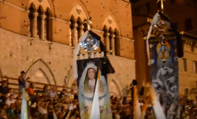 I due Drappelloni del “cappotto” storico della Lupa portati in trionfo in Piazza del Campo la sera del 16 agosto 2016