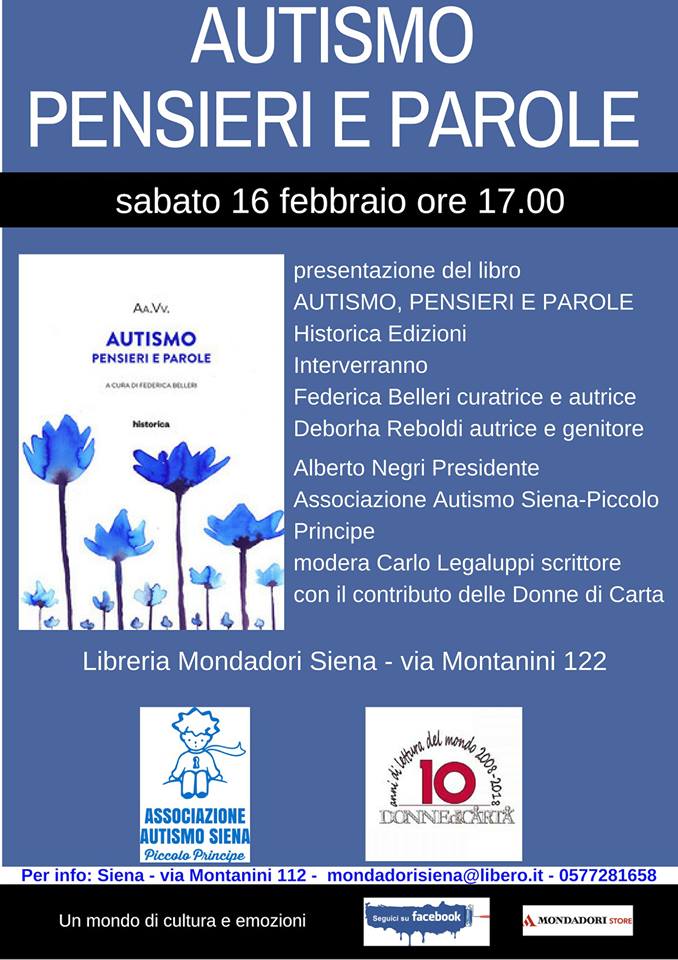 Sabato 16 febbraio ore 17.00 presentazione del libro “Autismo,pensieri e parole” Historica Edizioni. Interverranno Federica Belleri, curatrice e autrice, Dedorha Reboldi autrice e genitore e Alberto Negri Presidente dell’Associazione Autismo Siena-Piccolo Principe. Modera Carlo Legaluppi, scrittore. con il contributo delle Donne di Carta
