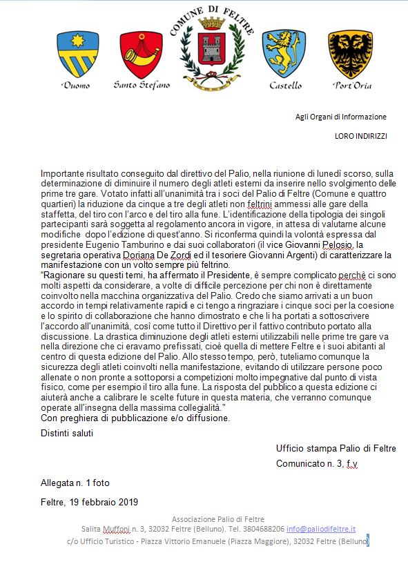 “Si trasmette il comunicato stampa relativo alla riunione del Direttivo del Palio di lunedì 18 febbraio 2019 con preghiera di pubblicazione e/o diffusione. Grazie. Distinti saluti.”