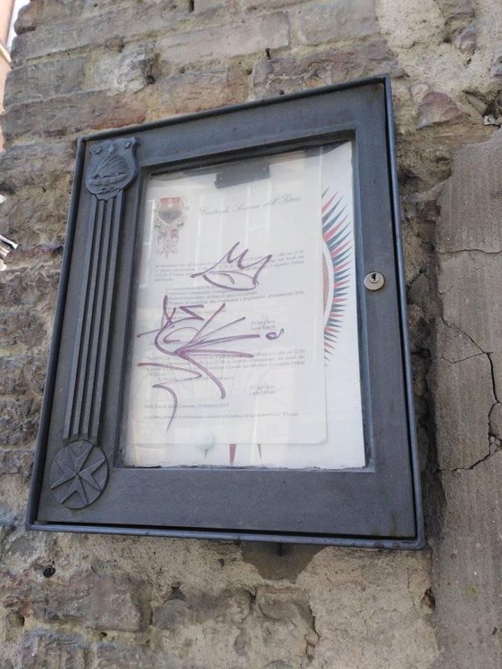 Nella notte appena trascorsa, fra ieri 22/02 e oggi 23/02, qualche imbecille ,e classifichiamolo così per non dire di peggio, ha ben pensato di sfogare la propria discutibile e orrenda vena artistica, scarabocchiando e scrivendo con un pennarello quasi sicuramente con inchiostro indelebile, la bacheca della Contrada, posta in Via Camollia. Purtroppo questa stucchevole e antipatica moda di deturpare gli oggetti appartenenti alle Contrade non tende a diminuire, e purtroppo anche per un fatto di emulazione, tali avvenimenti succedono con cadenza sempre più frequente. invoco ancora una volta l’installazione di più telecamere di sorveglianza in maniera che questi atti stupidi terminino, o si riesca a dare un volto e un nome e cognome agli autori di tali cretinate,