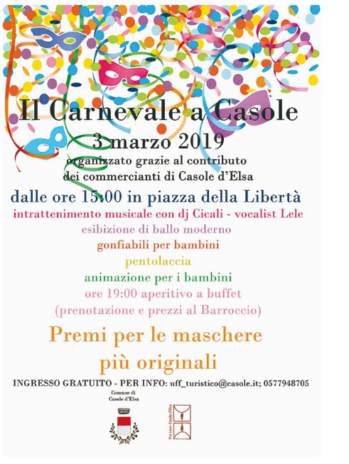Vi aspettiamo Domenica 3 marzo, dalle ore 15:00, nel centro storico di Casole. Dj Cicali e il vocalist Lele vi faranno ballare e cantare; i più piccoli potranno divertirsi con i gonfiabili e con l’animazione e trucca-bimbi; poi ci saranno due Pentolacce offerte da “ Il Barroccio” e da “ Bar Sport” da “spaccare”
