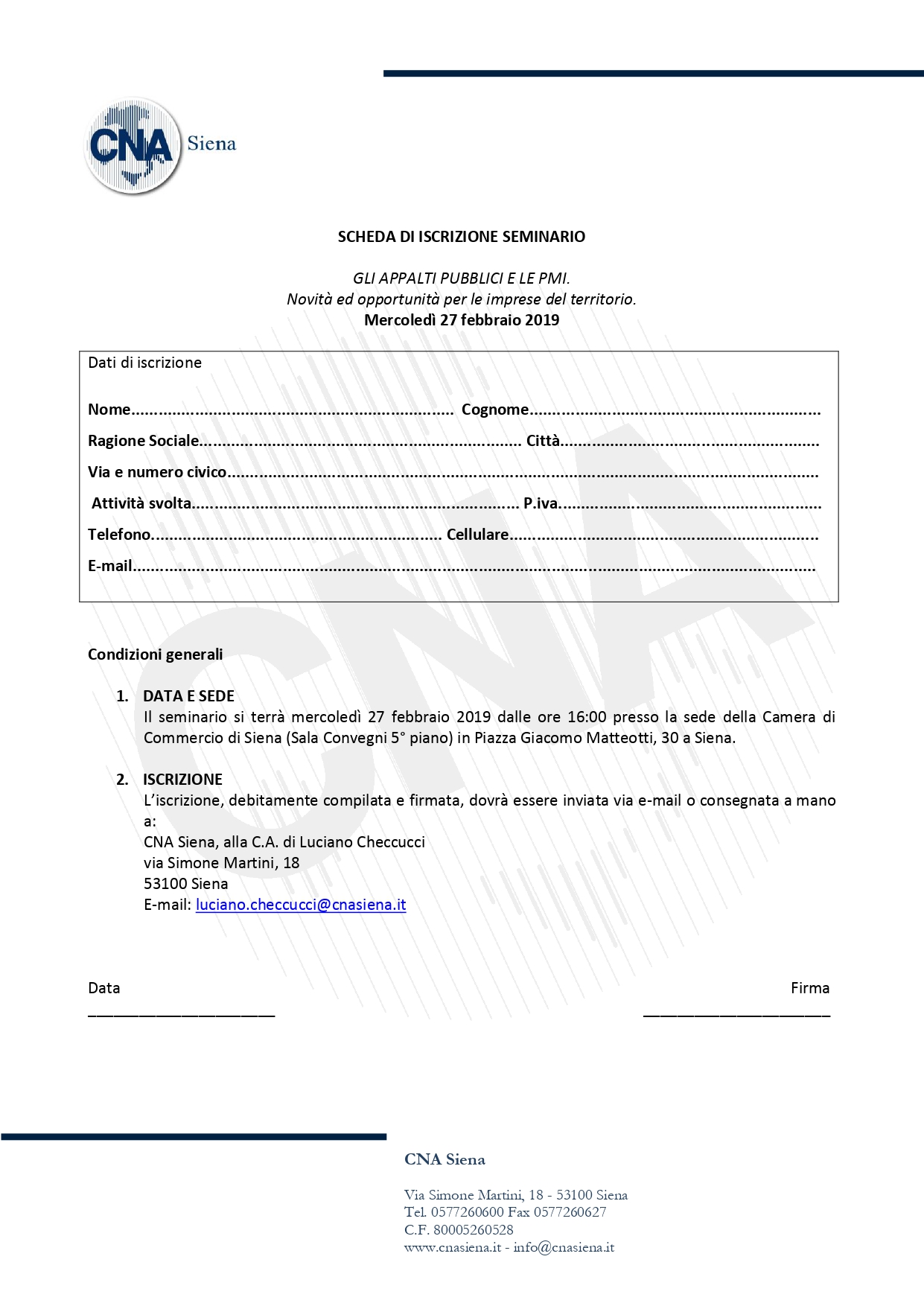 L’iscrizione, debitamente compilata e firmata, dovrà essere inviata via e-mail a luciano.checcucci@cnasiena.it o consegnata a mano a: