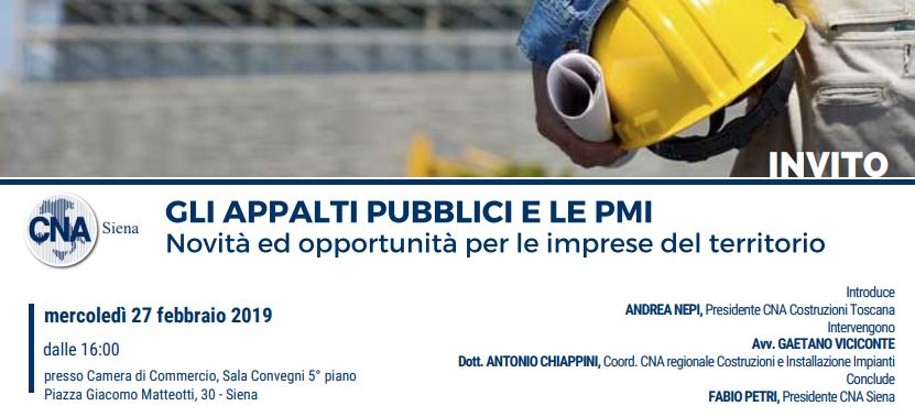 l seminario, dal titolo GLI APPALTI PUBBLICI E LE PMI. NOVITÀ ED OPPORTUNITÀ PER LE IMPRESE DEL TERRITORIO, si terrà mercoledì 27 febbraio 2019 dalle ore 16:00 presso la sede della Camera di Commercio di Siena (Sala Convegni 5° piano) in Piazza Giacomo Matteotti, 30 a Siena.