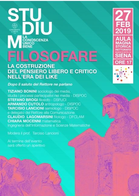 Il 27 febbraio, alle ore 17.00, in Aula magna storica del Rettorato si terrà l’incontro “Filosofare. La costruzione del pensiero libero e critico nell’era dei like”.