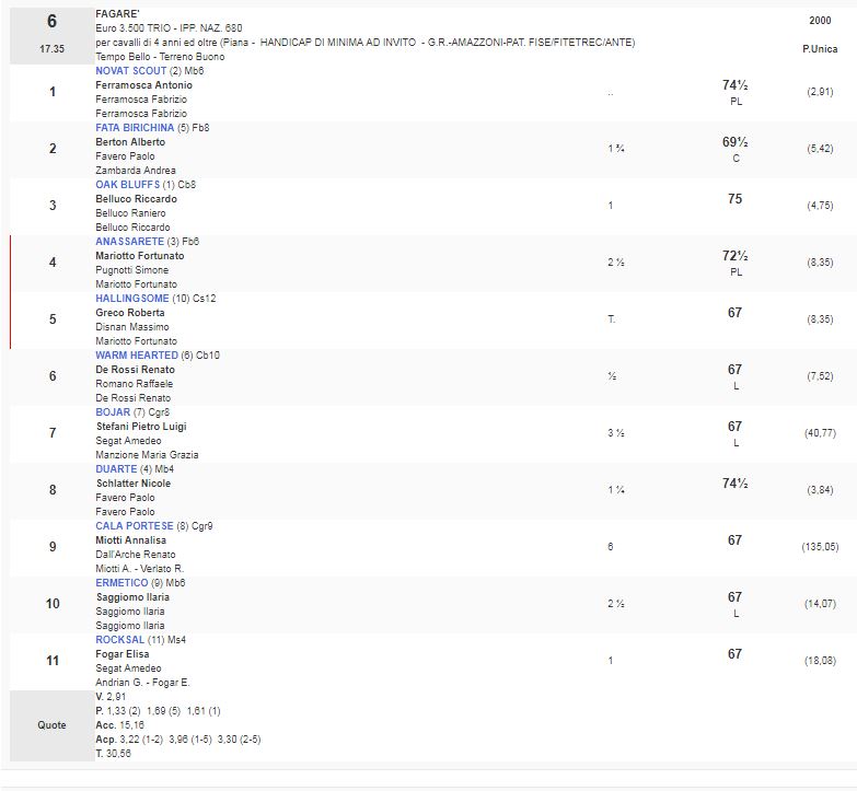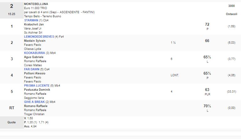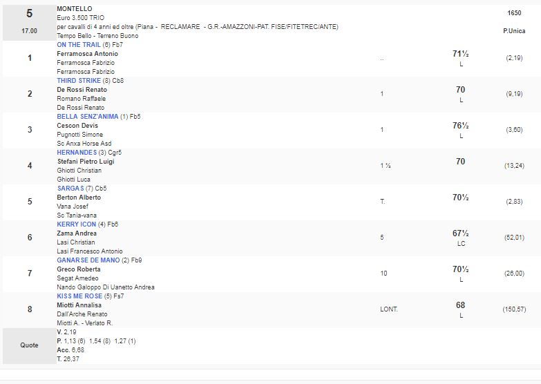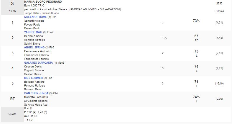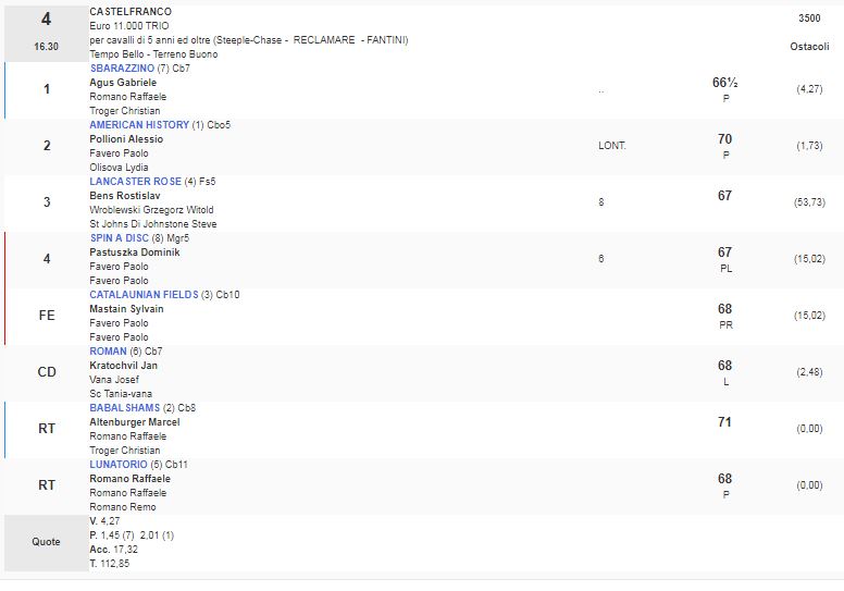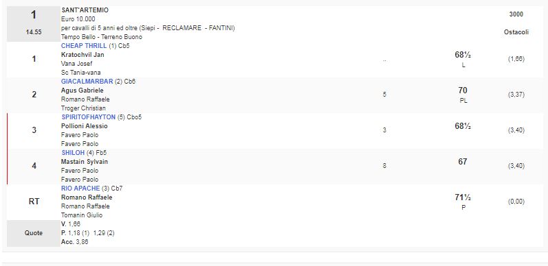Ippica, Treviso: Oggi 02/03 Resoconto Risultati Corse Odierne 1^ Corsa Premio Sant’Artemio vinta da Cheap Thrill 2^ Corsa Premio Montebelluna vinta da Starman 3^ Corsa Premio Marisa Buoro Pegoararo vinta da Queen of Rome 4^ Corsa Premio Castelfranco vinta da Sbarazzino 5^ Corsa Premio Montello vinta da On the Trail 6^ Corsa Premio Fagarè vinta da Novat Scout Condividi sul web: Fai clic per condividere su Facebook (Si apre in una nuova finestra) Facebook Fai clic per condividere su WhatsApp (Si apre in una nuova finestra) WhatsApp Fai clic per condividere su Telegram (Si apre in una nuova finestra) Telegram Fai clic per condividere su X (Si apre in una nuova finestra) X Fai clic qui per stampare (Si apre in una nuova finestra) Stampa Fai clic per inviare un link a un amico via e-mail (Si apre in una nuova finestra) E-mail Mi piace Caricamento... Correlati