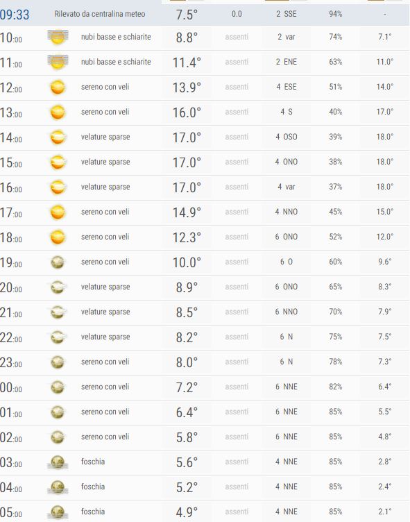 Al mattino Visibilita’ ridotta per banchi di nebbia, al pomeriggio Poco o parzialmente nuvoloso per stratificazioni medio alte, la sera Poco o parzialmente nuvoloso per stratificazioni medio alte, la notte. Sereno con foschia.”