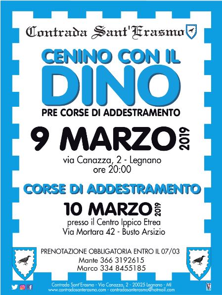 L’aria si riscalda in quel di Via Canazza, il countdown verso il 2 giugno è già iniziato, si inizia a fare sul serio; Sabato 9 marzo 2019, dalle ore 20, presso il maniero di Contrada, avremo la prima cena dell’anno in compagnia del nostro fantino, Dino Pes, che ci raggiungerà in vista delle corse di addestramento della Domenica (presso il Centro Ippico “Etrea”).