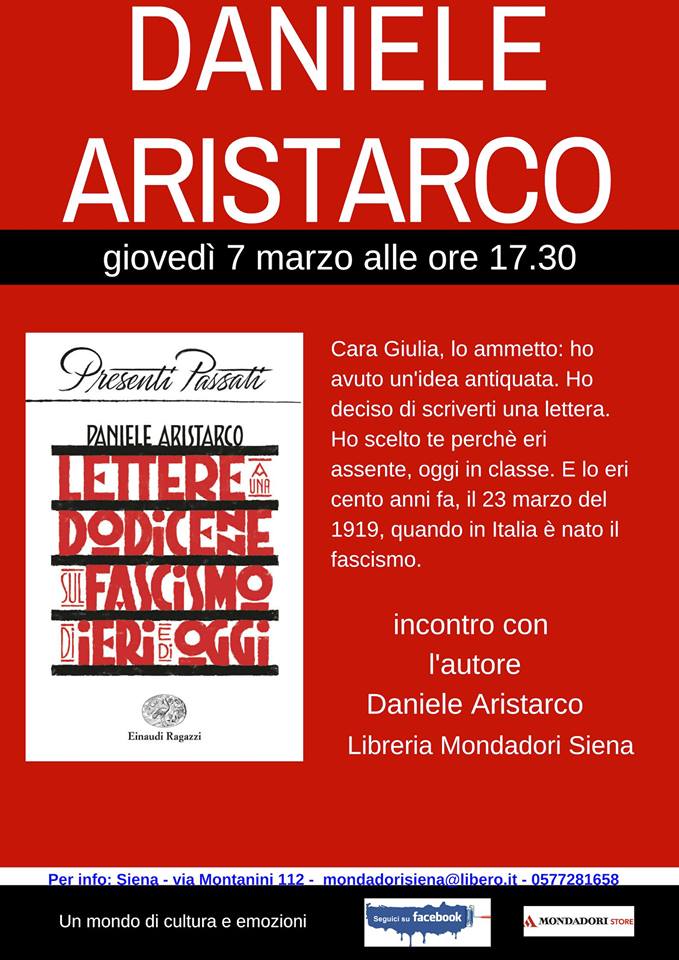 A distanza di un anno l’amico e scrittore Daniele Aristarco torna a trovarci a Siena. Con lui parleremo del suo nuovo libro intitolato “Lettere a una dodicenne sul fascismo di ieri e di oggi”. A 100 anni dalla sua nascita la Storia si può ripetere? I fantasmi del passato possono ripresentarsi? Come riconoscerli, come opporsi? Daniele esplora alcuni degli aspetti più complessi e contraddittori del nostro tempo. Attraverso una serie di lettere indirizzate a Giulia, una giovanissima studentessa, l’Autore narra la storia della dittatura fascista, prova a sbrogliarne gli intricati fili e indaga l’enigma del consenso. Con un pizzico di umorismo e uno stile chiaro e avvincente, queste pagine ripercorrono la storia italiana del Novecento per raggiungere la contemporaneità. Oltre ai principali avvenimenti, che vanno dalla nascita del movimento fascista al suo crollo rovinoso, alla fine della Seconda guerra mondiale, l’autore si sofferma sui contenuti e le caratteristiche culturali di un pensiero non del tutto scomparso