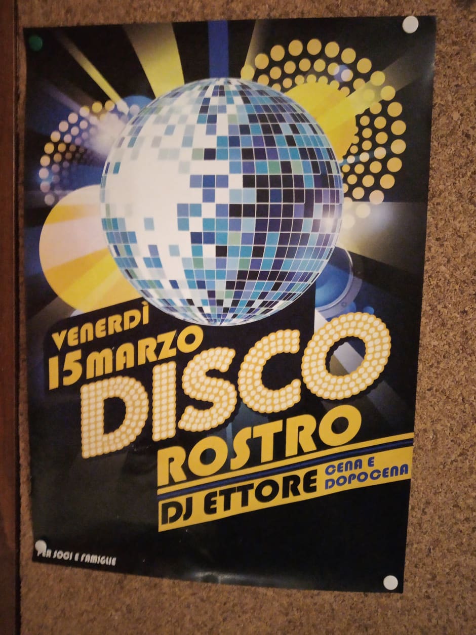 Il giorno 15/03 nei locali della Società “Il Rostro” si svolgerà la Serata “Disco Rostro” con il D.J. Ettore Chiesi.