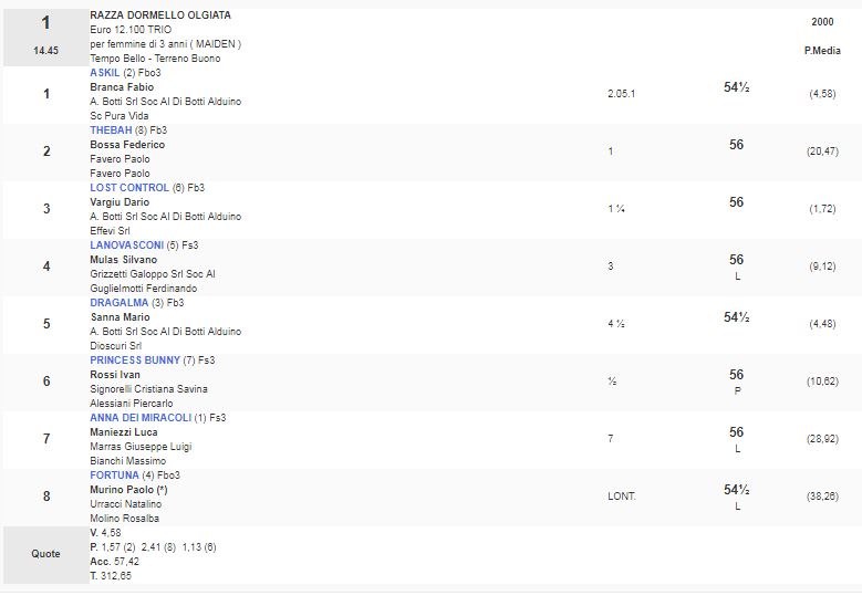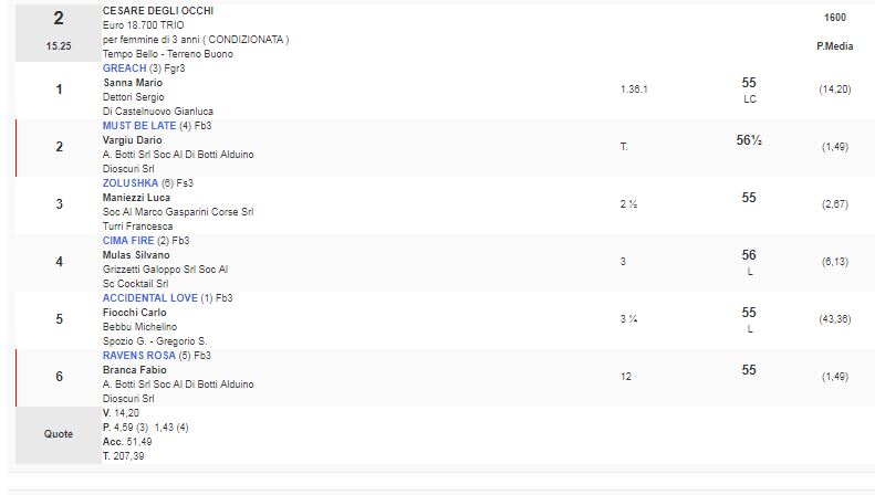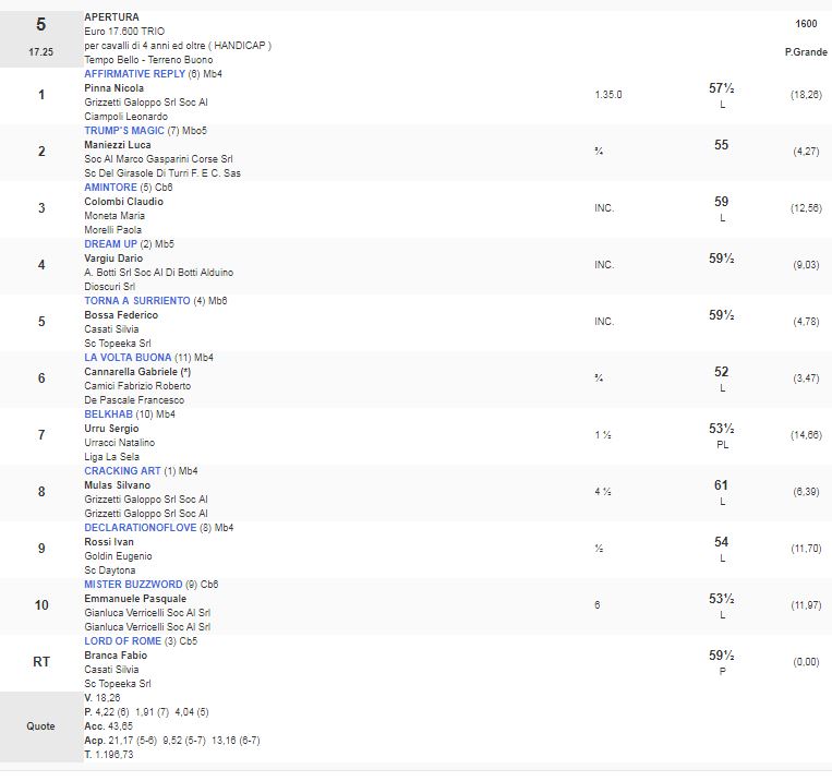 Ippica, Milano: Resoconto Risultati Corse Odierne del 16/03 1^ Corsa Premio Razza Dormello Olgiata vinta da Askil 2^ Corsa Premio Cesare degli Occhi vinta da Greach 3^ Corsa Premio Razza di Besnate vinta da Jighen 4^ Corsa Premio Calvairate vinta da Pensiero d’Amore 5^ Corsa Premio Apertura vinta da Affirmative Reply 6^ Corsa Premio Bareggio vinta da Raise the Bar Condividi sul web: Fai clic per condividere su Facebook (Si apre in una nuova finestra) Facebook Fai clic per condividere su WhatsApp (Si apre in una nuova finestra) WhatsApp Fai clic per condividere su Telegram (Si apre in una nuova finestra) Telegram Fai clic per condividere su X (Si apre in una nuova finestra) X Fai clic qui per stampare (Si apre in una nuova finestra) Stampa Fai clic per inviare un link a un amico via e-mail (Si apre in una nuova finestra) E-mail Mi piace Caricamento... Correlati