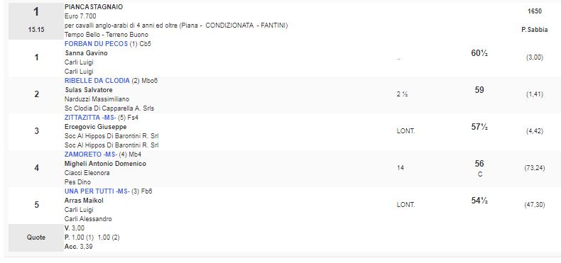 Ippica, Follonica: Oggi 20/03 Risultati 1^ Corsa Vince Forban du Pecos