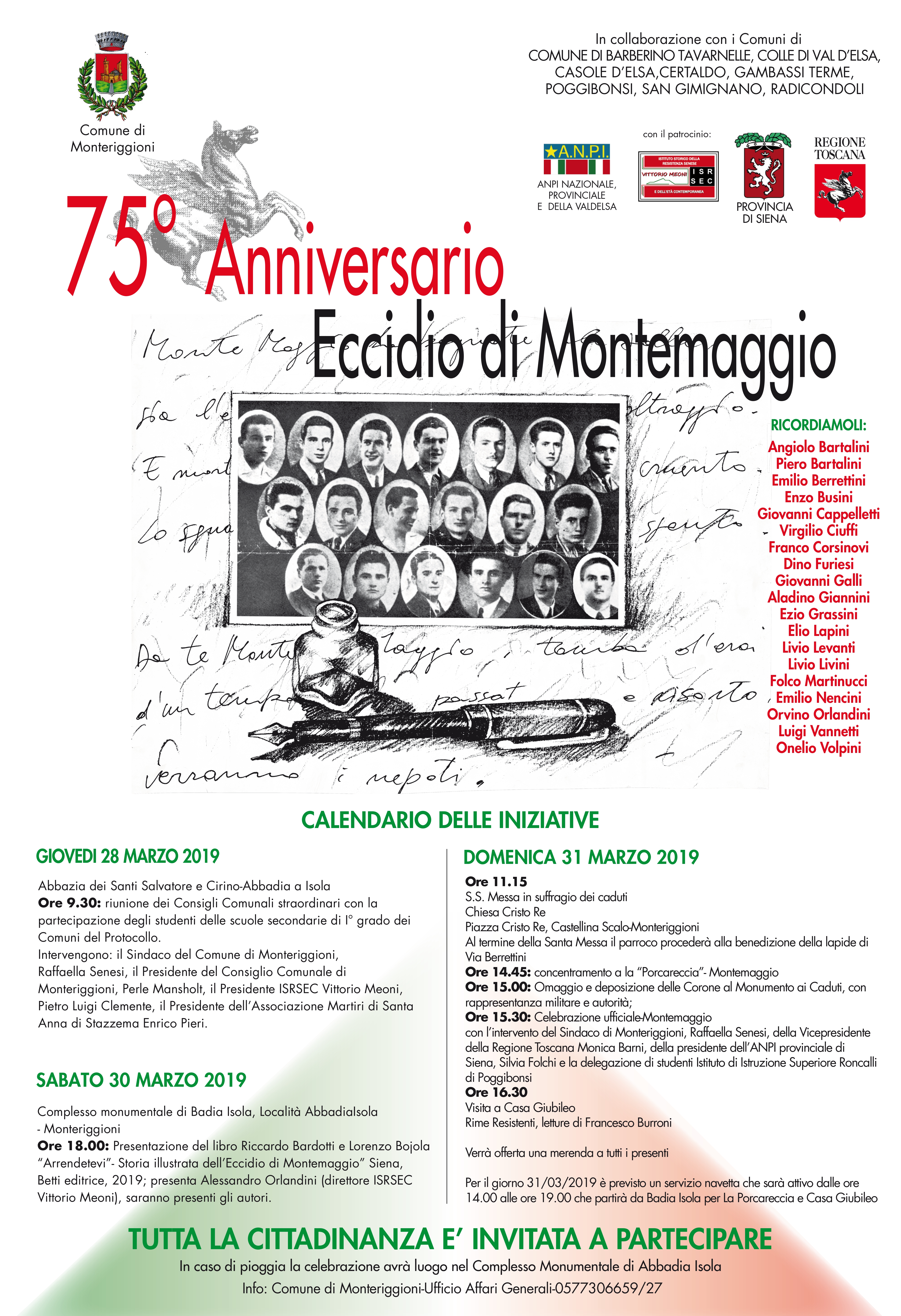 Il comune di Monteriggioni in collaborazione con i comuni di Barberino Tavarnelle, Colle di Val d’Elsa, Casole d’Elsa, Certaldo, Gambassi Terme, Poggibonsi, San Gimignano e Radicondoli in occasione del 75° anniversario dell’Eccidio di Montemaggio propongono una serie di iniziative a cui tutta la cittadinanza è invitata a partecipare. La commemorazione inizierà giovedì 28 marzo 2019 alle ore 9.30 con la Convocazione Consiglio Comunale in adunanza aperta, sessione straordinaria e congiunta con i Consigli Comunali dei Comuni della Valdelsa Senese e Fiorentina – “Celebrazione 75° Anniversario Eccidio di Montemaggio”