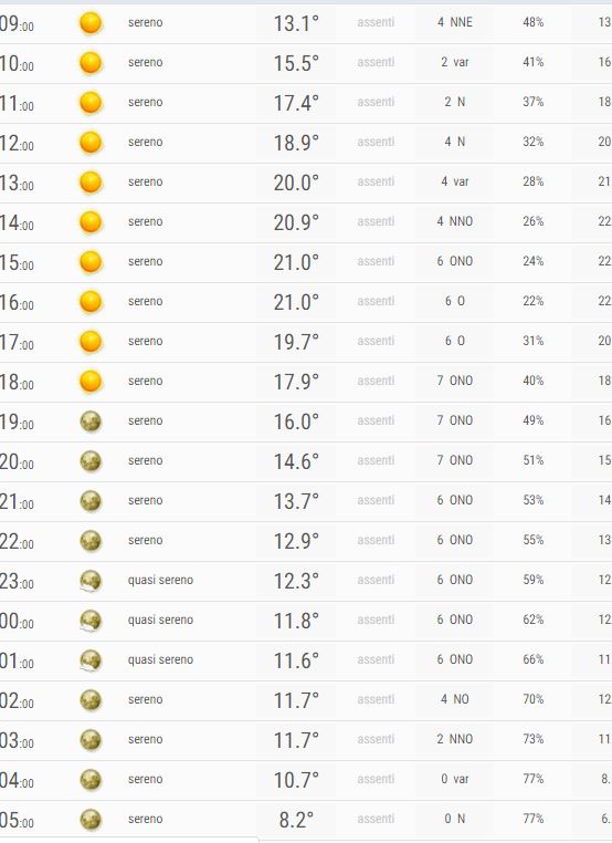 Al mattino Sereno, al pomeriggio Sereno, la sera Sereno, la notte Sereno o poco nuvoloso.