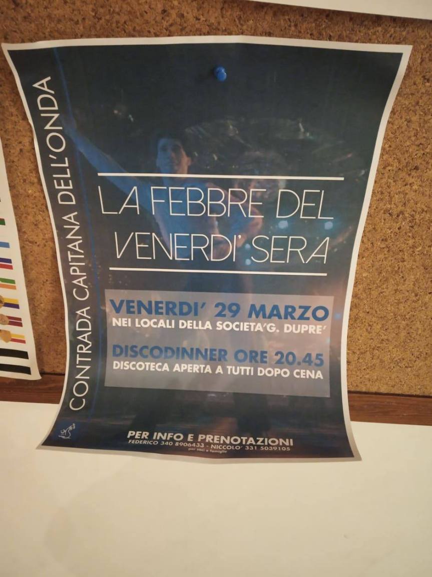 Siena, Contrada dell’Onda: 29/03 ” La Febbre del Venerdì Sera” La Contrada dell’onda organizza Venerdì 29/03 la Serata ” la Febbre del Venerdì Sera”. La Serata si svolgerà nel seguente modo: ore 20.45 Disco Dinner Dopo Cena Discoteca aperta a tutti Per info e partecipare guardare la locandina sotto Condividi sul web: Fai clic per condividere su Facebook (Si apre in una nuova finestra) Facebook Fai clic per condividere su WhatsApp (Si apre in una nuova finestra) WhatsApp Fai clic per condividere su Telegram (Si apre in una nuova finestra) Telegram Fai clic per condividere su X (Si apre in una nuova finestra) X Fai clic qui per stampare (Si apre in una nuova finestra) Stampa Fai clic per inviare un link a un amico via e-mail (Si apre in una nuova finestra) E-mail Mi piace Caricamento... Correlati