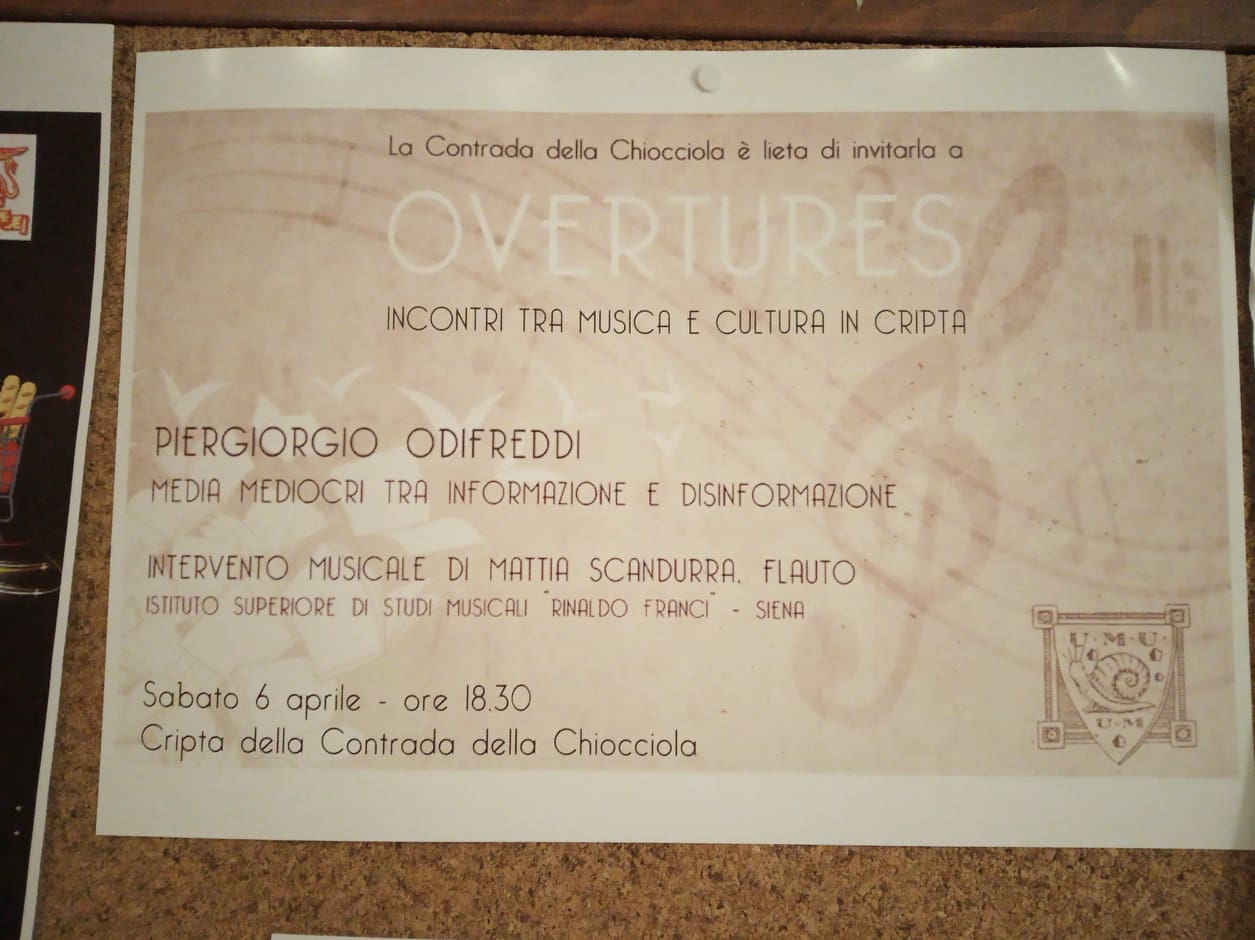 Nell’ottica di valorizzare il ruolo originario delle contrade come centri di aggregazione e promozione sociale e culturale, la Chiocciola torna a presentare “Overtures. Incontri tra musica e cultura in Cripta”, dove l’idea dell’apertura, del dialogo, del confronto sono fondanti.