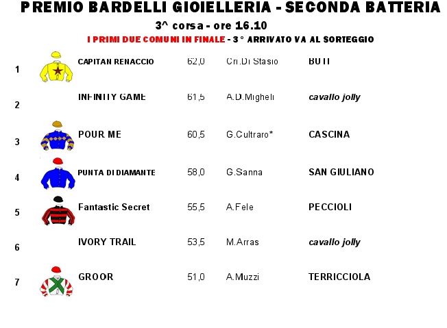 “Domani 31/03 sulla pista dell’Ippodromo San Rossore va in scena l’ottava edizione del “Palio dei Comuni della Provincia di Pisa”. I comuni che superano le batterie e accedono alla finale, scelgono il cavallo per il Palio Ippico secondo l’ordine stabilito dalla CLASSIFICA DEI COMUNI.Le corse scelte come batterie sono tre e i primi due classificati delle prime batterie, più i primi tre classificati della terza batteria, oltre ad un ripescato, accederanno alla finale da 8 partenti.”