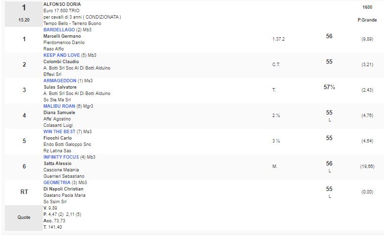 Ippica, Roma: Oggi 31/03 Risultati 1^ e 2^ Corsa Vincono Bardellago e Rose and Crown 1^ Corsa Premio Alfonso Doria vinta da Bardellago 2^ Corsa Premio Saccaroa vinta da Rose and Crown Condividi sul web: Fai clic per condividere su Facebook (Si apre in una nuova finestra) Facebook Fai clic per condividere su WhatsApp (Si apre in una nuova finestra) WhatsApp Fai clic per condividere su Telegram (Si apre in una nuova finestra) Telegram Fai clic per condividere su X (Si apre in una nuova finestra) X Fai clic qui per stampare (Si apre in una nuova finestra) Stampa Fai clic per inviare un link a un amico via e-mail (Si apre in una nuova finestra) E-mail Mi piace Caricamento... Correlati