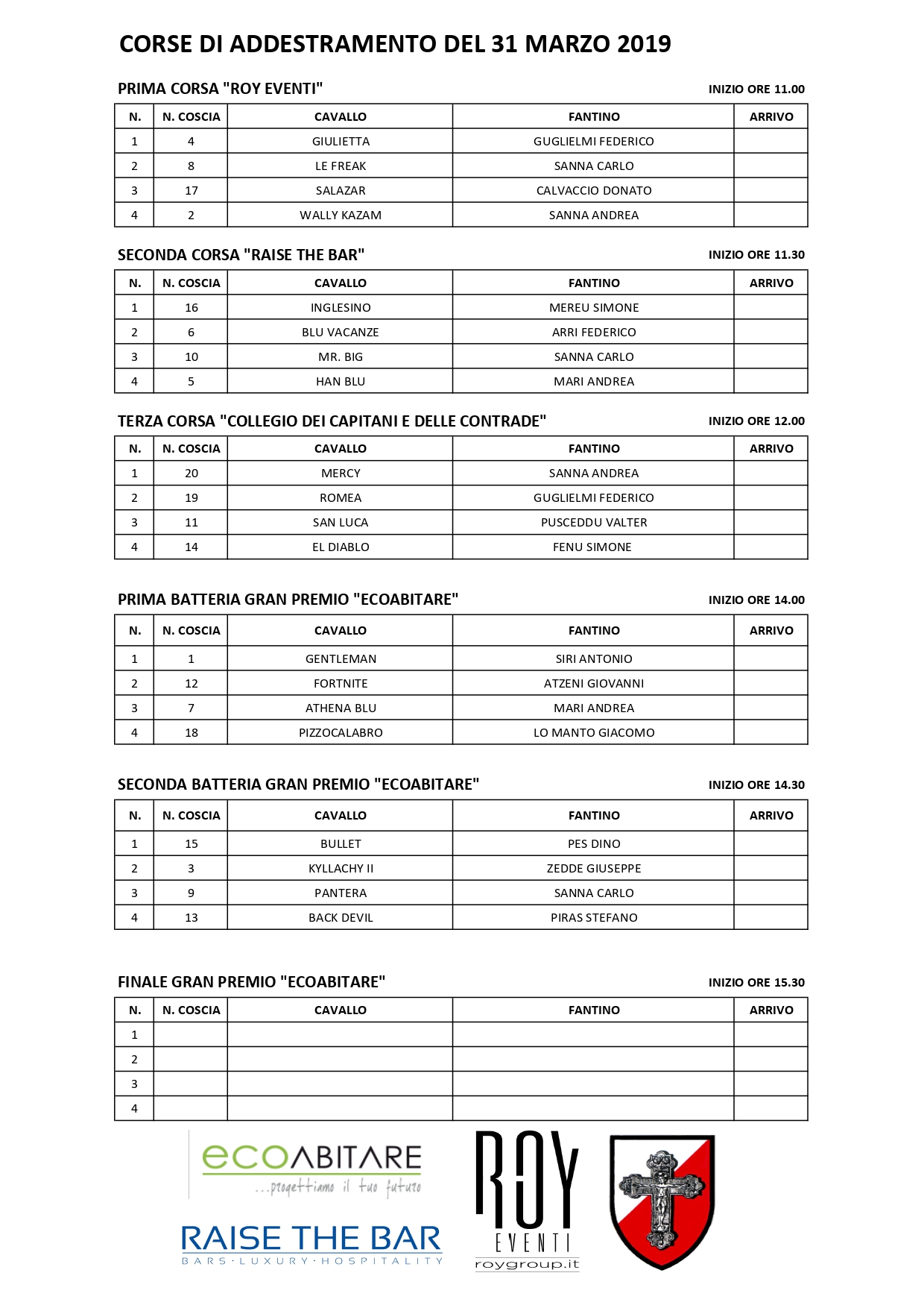Oggi 31/03 si svolge la Seconda Giornata di Corse di Addestramento presso Etrea Sport Horses. Fra poco meno di 45 minuti scenderanno sulla nuova pista i cavalli per un’altra appassionante sfida in attesa del Palio del 02/06. Sono in programma sei Corse, tre la mattina e tre il pomeriggio, dove saranno svolte due batterie di qualifica per il Gran Premio “Ecoabitare”, sponsor della Giornata di Corse insieme a “Roy Eventi”, “Raise the Bar” e “Collegio dei Capitani” che è anche l’ente organizzatore delle Corse di Addestramento. Dopo la terza Corse del mattina prevista all’incirca alle ore 12 ci sarà la pausa pranzo, per poi riprendere le Corse pomeridiane intorno alle 14. Inizio convegno ore 11, ultima Corsa ore 15.30.