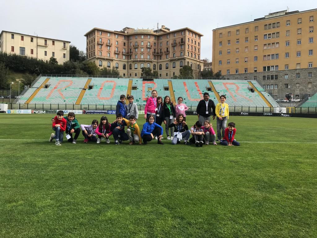 Puntata particolare di “Robur@School”, iniziativa della società bianconera nell’ambito del progetto 3P (Patto, Passione, Partecipazione). Questa mattina la 4 B della scuola don Milani di Monteriggioni ha fatto visita alla Robur Siena, con un tour guidato all’interno dello stadio Artemio Franchi. Gli alunni sono stati accolti in sala hospitality dalla presidente Anna Durio e dal vice presidente Federico Trani, con il direttore marketing Vincenzo Federico che ha illustrato le dinamiche dei rapporti tra la società ed i suoi partner. Successivamente mister Michele Mignani si è sottoposto alle domande dei piccoli alunni-giornalisti, ed i calciatori Nicola Belmonte, Lorenzo Di Livio e Federico Chiossi hanno svelato i segreti degli spogliatoi ed accompagnato i ragazzi in campo, con il suggestivo ingresso dal tunnel. L’esperienza si è conclusa con autografi e foto in panchina e sull’erba del Rastrello, per l’emozione e la gioia dei piccoli studenti che hanno conosciuto da vicino il mondo “Robur”.