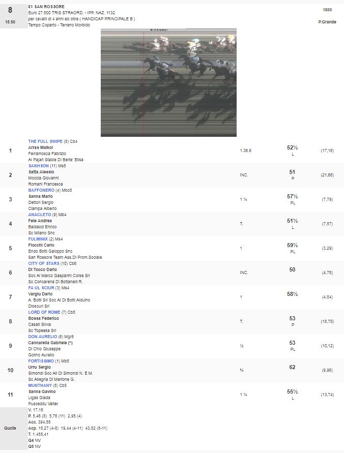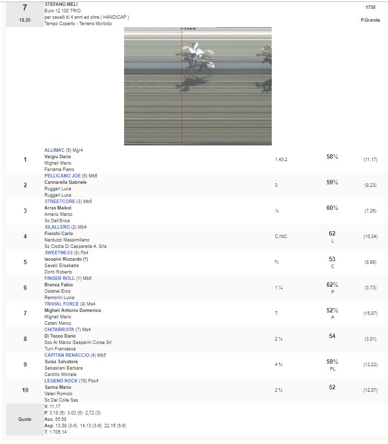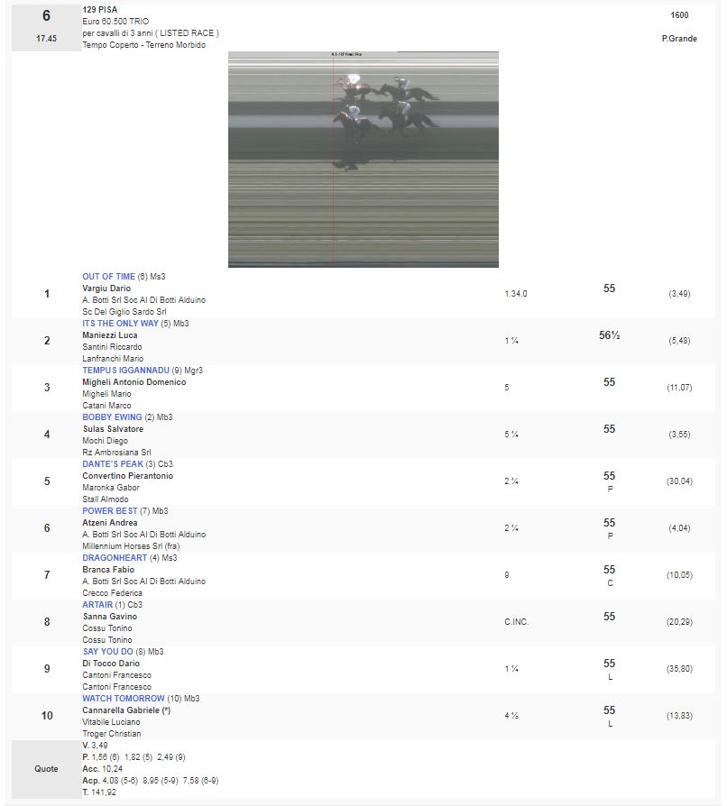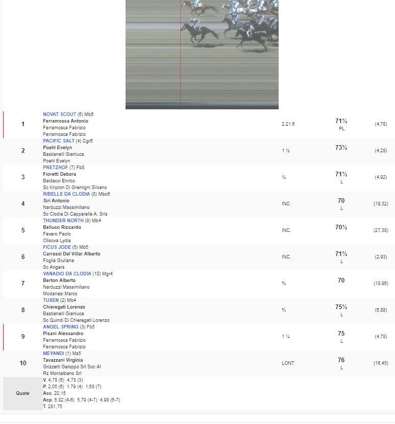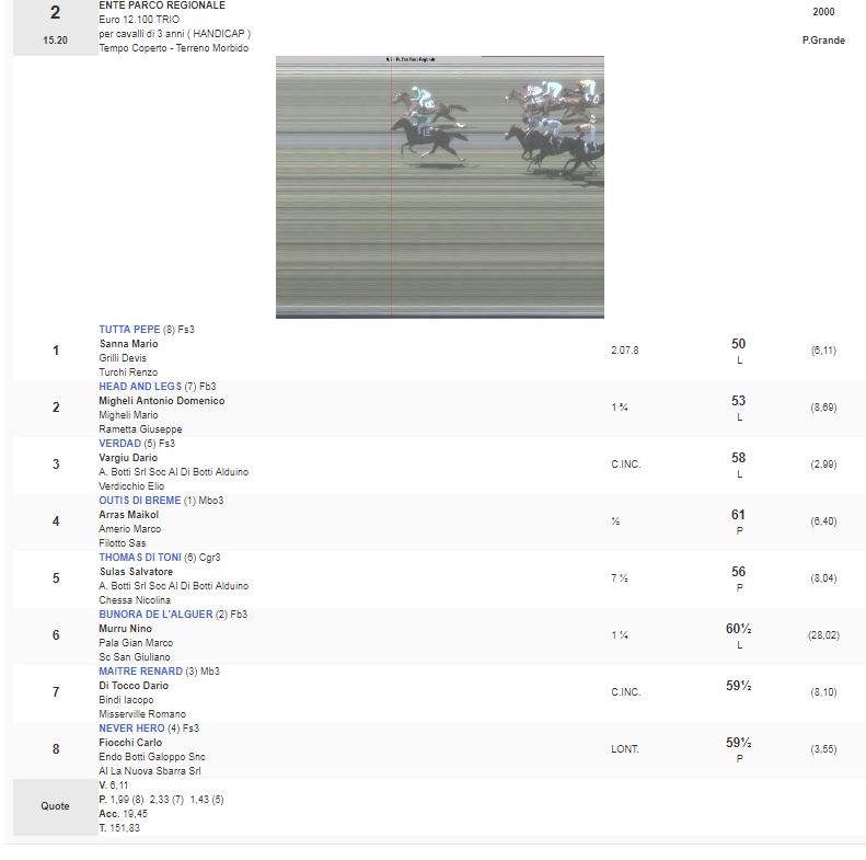 Ippica, Pisa: Oggi 07/04 Risultati Corse Odierne 1^ Corsa Trofeo Borromeo – Trofeo Agri vinta da Novat Scout 2^ Corsa Premio Ente Parco Regionale vinta da Tutta Pepe 3^ Corsa Premio 20 Regione Toscana vinta da O’Juke 4^ Corsa Premio Banca di Pisa e Fornacette vinta da Philomena 5^ Corsa Premio Longines Fegentri Amateru Ride vinta da StaisenzaPensieri 6^ Corsa Premio 129 Pisa vinta da Out of Time 7^ Corsa Premio Stefano Meli vinta da Allimac 8^ Corsa Premio 61 San Rossore vinta da The Full Swipe Condividi sul web: Fai clic per condividere su Facebook (Si apre in una nuova finestra) Facebook Fai clic per condividere su WhatsApp (Si apre in una nuova finestra) WhatsApp Fai clic per condividere su Telegram (Si apre in una nuova finestra) Telegram Fai clic per condividere su X (Si apre in una nuova finestra) X Fai clic qui per stampare (Si apre in una nuova finestra) Stampa Fai clic per inviare un link a un amico via e-mail (Si apre in una nuova finestra) E-mail Mi piace Caricamento... Correlati