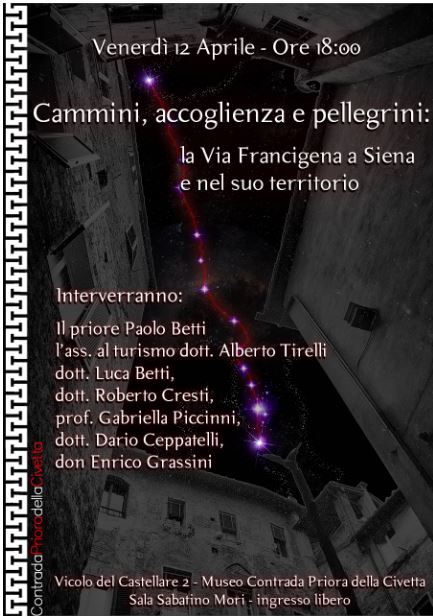 Si comunica che il giorno 12 aprile alle ore 18.00 sí terrà, all’interno della sede museale della Contrada Priora della Civetta (piazzetta del Castellare 2), un intervento dal titolo “Cammini, accoglienza e pellegrini: la Via Francigena a Siena e nel suo territorio”.