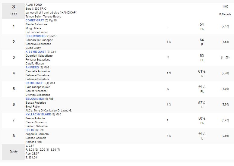 Ippica, Siracusa: Oggi 13/04 Risultati 3^, 4^ e 5^ Corsa Vincono Comet Grey, 3^ Corsa Premio Alan Ford vinta da Comet Grey 4^ Corsa Premio At Talaq vinta da Saint Seven 5^ Corsa Premio Lattanzio Gambara vinta da BellaGianlu Condividi sul web: Condividi su Facebook (Si apre in una nuova finestra) Facebook Condividi su WhatsApp (Si apre in una nuova finestra) WhatsApp Condividi su Telegram (Si apre in una nuova finestra) Telegram Condividi su X (Si apre in una nuova finestra) X Stampa (Si apre in una nuova finestra) Stampa Invia un link a un amico via e-mail (Si apre in una nuova finestra) E-mail Mi piace Caricamento... Correlati