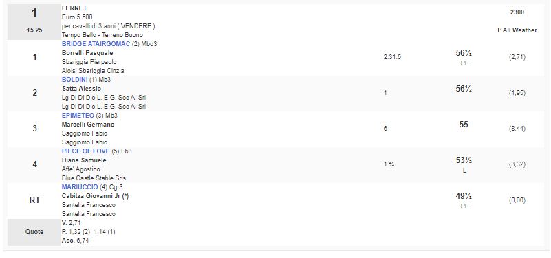 Ippica, Roma: Oggi 19/04 Risultati 1^ e 2^ Corsa Vincono Bride Atairgomac e Bufera 1^ Corsa Premio Fernet vinta da Bridge Atairgomac 2^ Corsa Premio Zomaradah vinta da Bufera Condividi sul web: Fai clic per condividere su Facebook (Si apre in una nuova finestra) Facebook Fai clic per condividere su WhatsApp (Si apre in una nuova finestra) WhatsApp Fai clic per condividere su Telegram (Si apre in una nuova finestra) Telegram Fai clic per condividere su X (Si apre in una nuova finestra) X Fai clic qui per stampare (Si apre in una nuova finestra) Stampa Fai clic per inviare un link a un amico via e-mail (Si apre in una nuova finestra) E-mail Mi piace Caricamento... Correlati