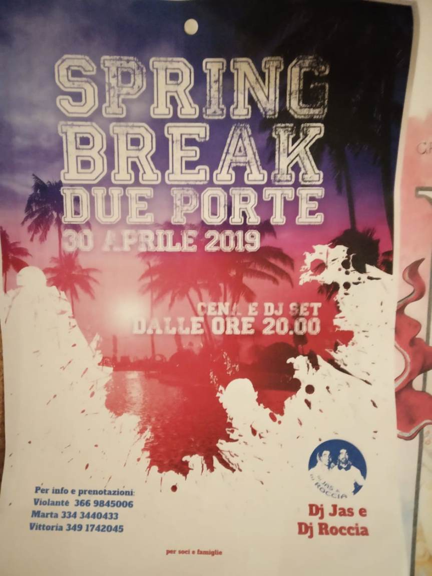 La Società due Porte all’interno dei propri locali organizza per martedì 30/04 la Serata “Spring Break Due Porte” con Cena e Dj Set dei Dj Jas e Roccia con inizio fissato alle ore 20.00.