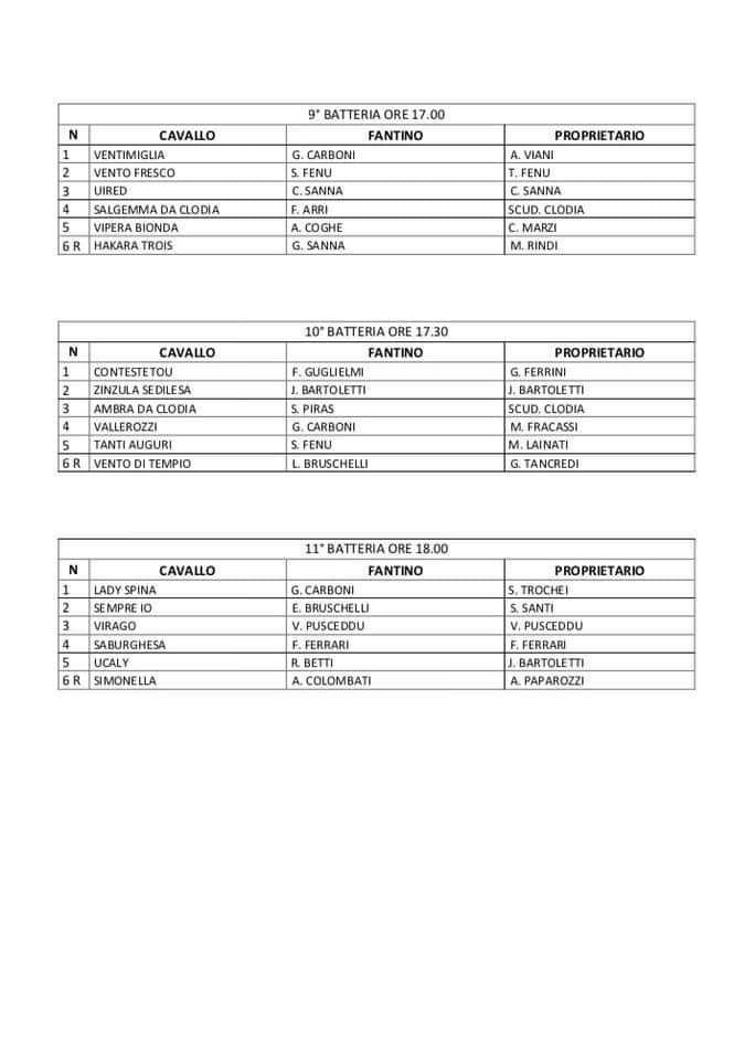 Si tratta di 11 Batterie con inizio alle ore 10.00 e l’ultima Batteria prevista per le ore 18.00. Pausa pranzo fra la quarta Batteria ( ore 11.30) e la quinta Batteria ( ore 15.00 ).