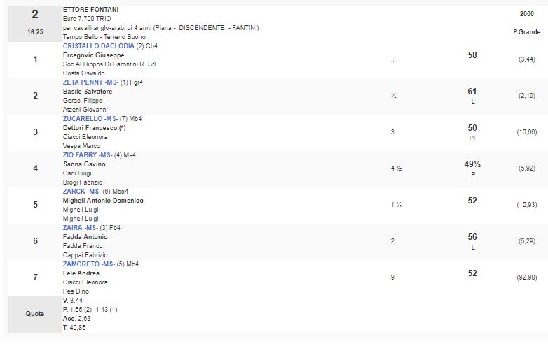 2^ Corsa Premio Ettore Fontani vinta da Cristallo da Clodia da Lord de Bonorva e Bosilvia da Clodia di proprietà di Osvaldo Costa e allenato da Soc All Hippos di R. Barontini Srl