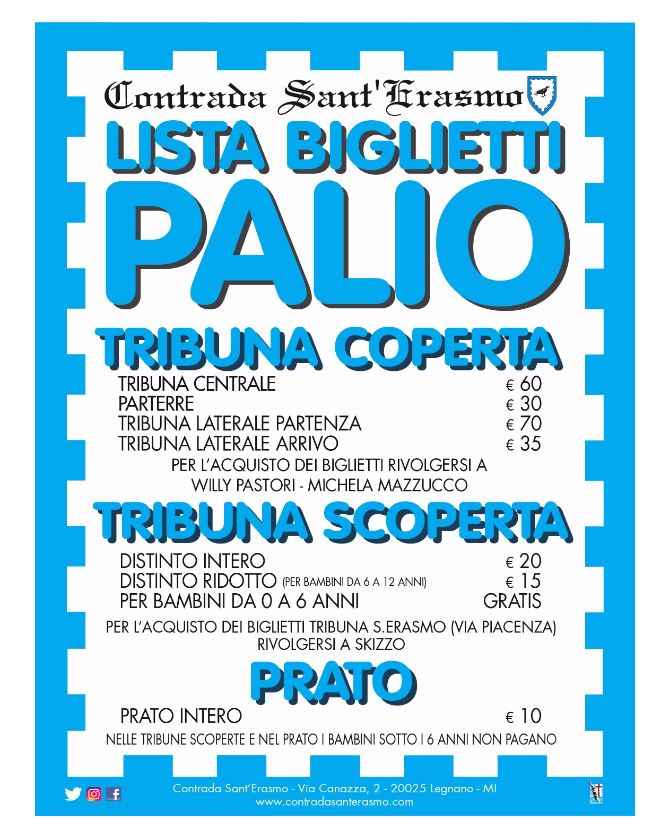 Di seguito è riportata la locandina dove si possono trovare tutte le informazioni relative ai biglietti per il Palio 2019 con i relativi costi.