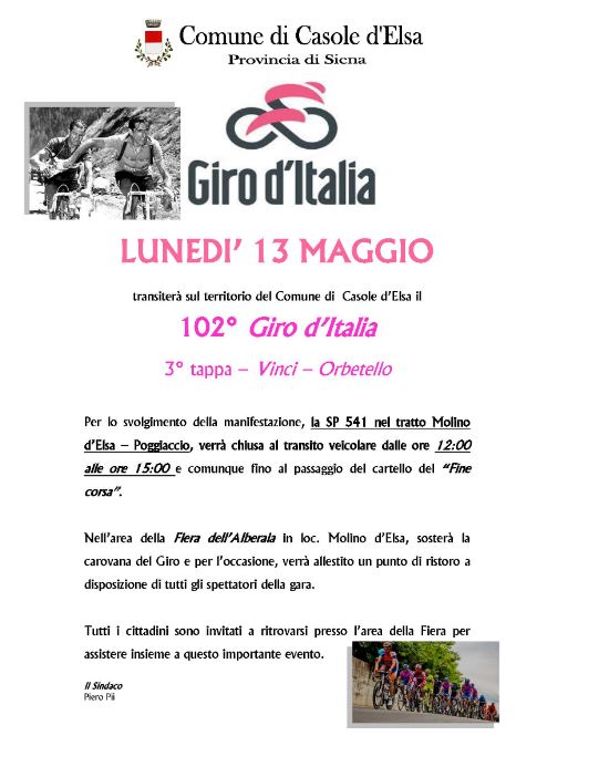 Si comunica che Lunedì 13 Maggio 2019 transiterà sul territorio del Comune di Casole d’Elsa il 102° Giro d’Italia – 3° tappa Vinci – Orbetello.