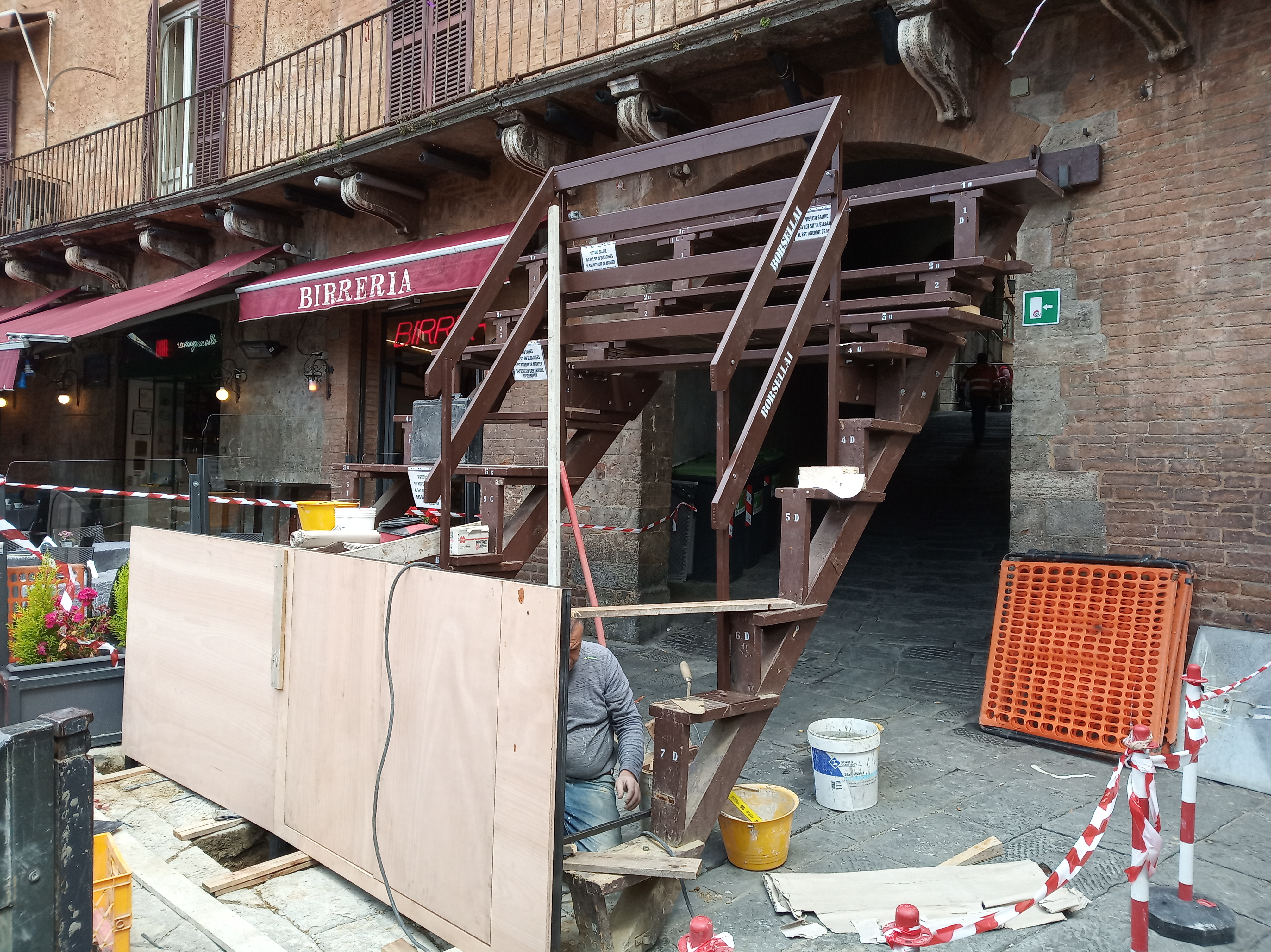 Sono in corso d’opera le operazioni di montaggio del Palco del Vicolo dei Borsellai per testarne la stabilità e la tenuta. Continuano i monitoraggi dell’Ammistrazione Comunale sui palchi del Magistrato delle Contrade che fino ad ora hanno dato risultati buoni per stabilità e sicurezza.