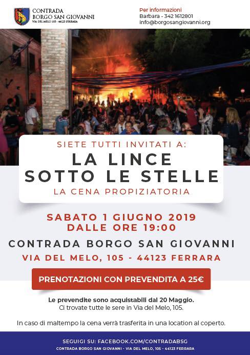 La Contrada Borgo San Giovanni apre le sue porte e vi invita alla CENA PROPIZIATORIA – “LA LINCE SOTTO LE STELLE “, in via del Melo, 105, l’1 Giugno dalle ore 19.00. Vi aspettiamo numerosi alla cena più importante dell’anno, a sostenere insieme i nostri quattro Campioni che onoreranno il Rosso ed il Blu in Piazza Ariostea. ❤️💙