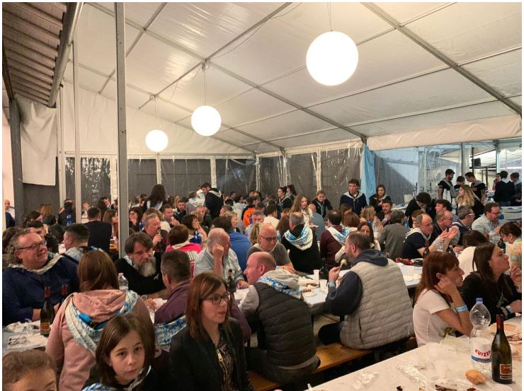 “Più di 360 commensali, tutti comodamente distribuiti tra il salone delle cene e la tensostruttura nel cortile del Maniero, hanno potuto apprezzare ancora una volta l’eccezionale carne cucinata tutta rigorosamente alla brace dal nostro incredibile e infaticabile Gruppo Griglia: salamelle, spiedini, costine e le due portate principali il CODONE e la novità del 2019, il BEEF RIBS o costata di manzo. La cucina poi ha completato la cena con il tomino, un’insalata di patate e cipolle come contorno e per dolce mousse alla menta con gocce di cioccolato.