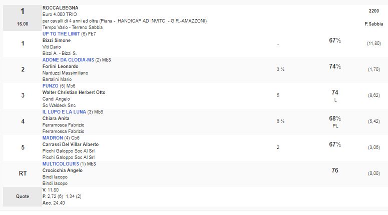 1^ Corsa Premio Roccalbegna vinta da Up to The Limit da Fast Company e Nouvelle Nova di proprietà di A.Bizzi – S. Bizzi allenato da Dario Viti. Segnalo che Adone da Clodia cavallo Anglo-Arabo ha corso contro i Purosangue ben figurando e piazzandosi al secondo posto.