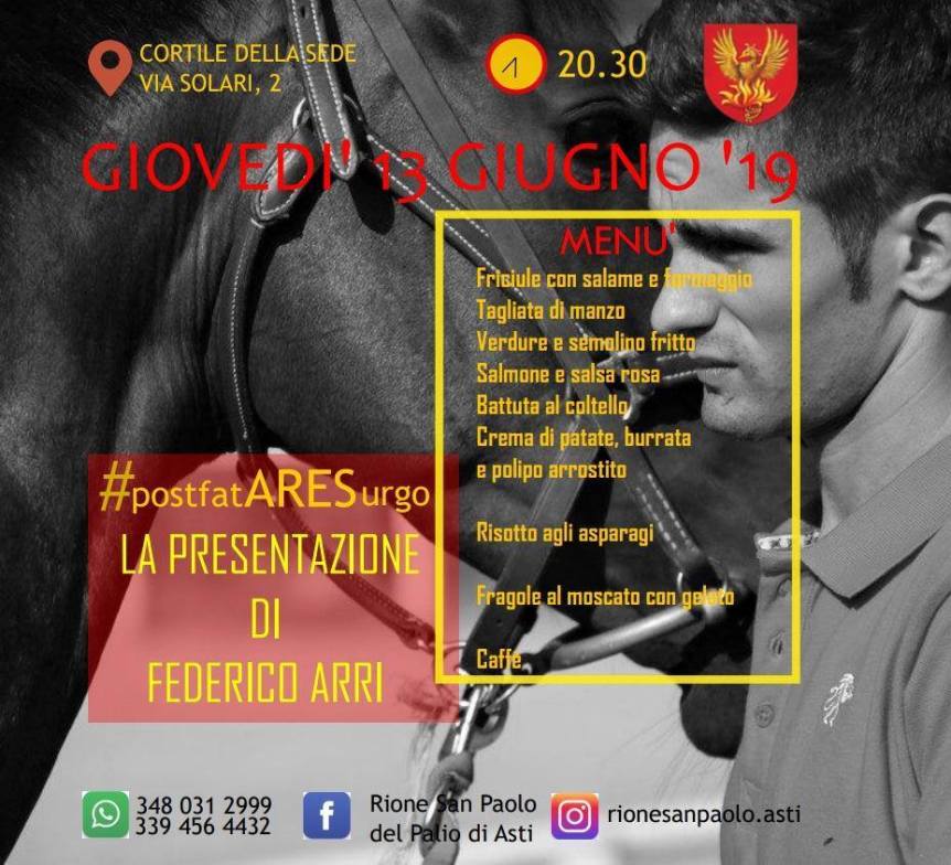 Il Comitato Palio Rione San Paolo è lieto di invitarvi Giovedì 13 Giugno 2019 dalle ore 20:30 presso il cortile della sede in Via Bonzanigo (angolo via Solari) alla Presentazione del Fantino che correrà il Palio di Asti 2019 con i colori di San Paolo che sarà Federico Arri, detto Ares.