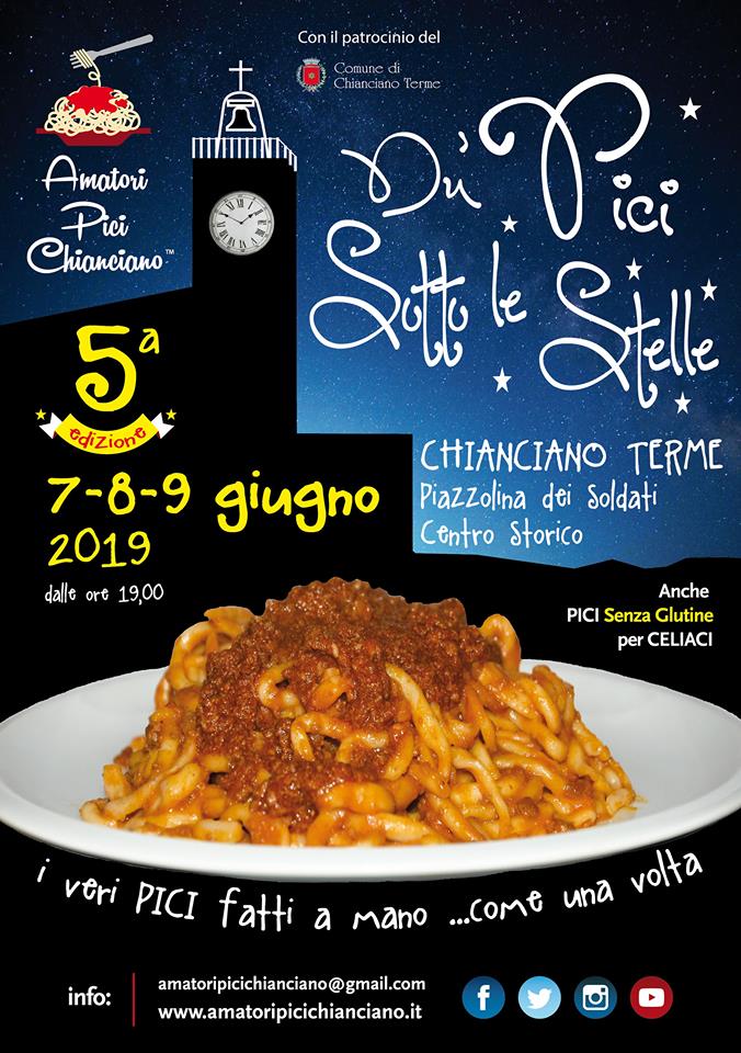 La manifestazione, giunta alla sua quinta edizione, è organizzata dall’Associazione Amatori Pici Chianciano. La storica Piazzolina Dei Soldati nel borgo del paese farà come di consueto da cornice per la festa in onore della blasonata pasta tradizionale del sud senese per un intero fine settimana all’insegna dell’enogastronomia di qualità a base di Pici.