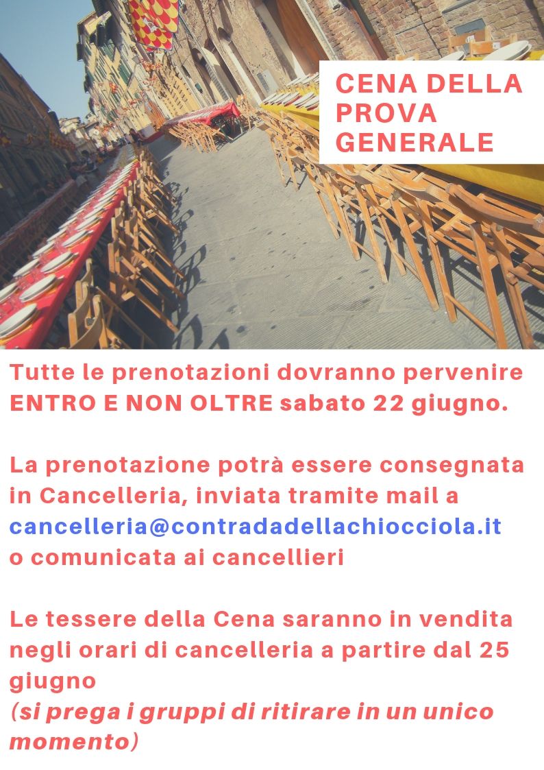 Ricordiamo che la Cena della Prova Generale sarà come sempre con tessere numerate. Tutte le prenotazioni dovranno pervenire entro e non oltre sabato 22 giugno.