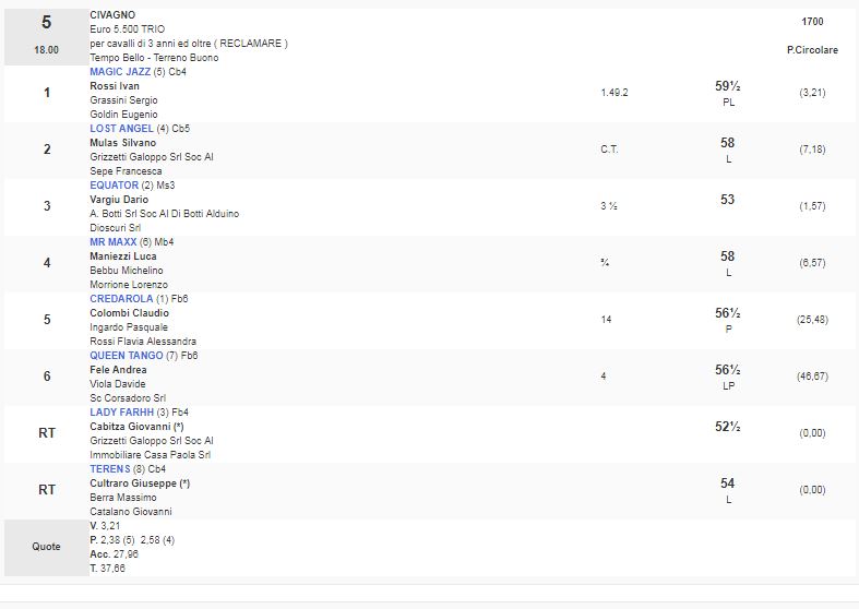 Ippica, Milano: Oggi 05/06 Risultati 3^, 4^ e 5^ Corsa Vincono Anacleto, Acqua e Sale e Magic Jazz 3^ Corsa Premio Vedano al Lambro vinta da Anacleto 4^ Corsa Premio Cassiopea vinta da Acqua e Sale 5^ Corsa Premio Civagno vinta da Magic Jazz Condividi sul web: Fai clic per condividere su Facebook (Si apre in una nuova finestra) Facebook Fai clic per condividere su WhatsApp (Si apre in una nuova finestra) WhatsApp Fai clic per condividere su Telegram (Si apre in una nuova finestra) Telegram Fai clic per condividere su X (Si apre in una nuova finestra) X Fai clic qui per stampare (Si apre in una nuova finestra) Stampa Fai clic per inviare un link a un amico via e-mail (Si apre in una nuova finestra) E-mail Mi piace Caricamento... Correlati